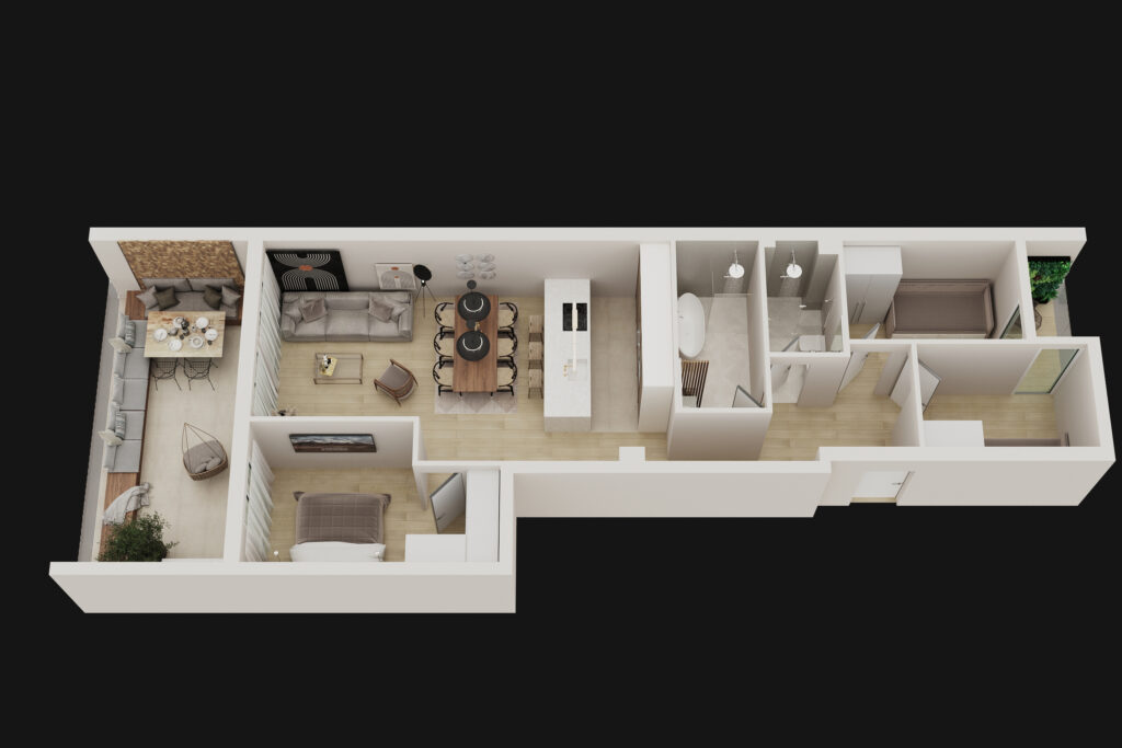 El presente proyecto tiene como objeto el cambio de uso de un local comercial a vivienda, configurando un programa funcional de tres dormitorios, dos baños y un patio privativo.